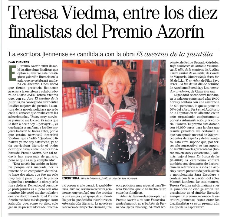 Un sueño hecho realidad… Finalista del Premio Azorín de Novela 2021. Descubre más desde TERESA VIEDMA JURADO Suscríbete y recibe las últimas entradas en tu correo electrónico. Escribe tu correo electrónico… Suscribirse Comparte esto: Haz clic para compartir en X (Se abre en una ventana nueva) X Haz clic para compartir en Facebook (Se abre en una ventana nueva) Facebook Haz clic para compartir en WhatsApp (Se abre en una ventana nueva) WhatsApp Más Haz clic para compartir en LinkedIn (Se abre en una ventana nueva) LinkedIn Me gusta Cargando... Relacionado