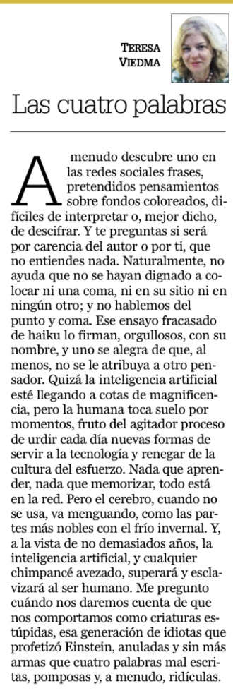 Las cuatro palabras Publicado en Diario Jaén el 30/5/2023 Descubre más desde TERESA VIEDMA JURADO Suscríbete y recibe las últimas entradas en tu correo electrónico. Escribe tu correo electrónico… Suscribirse Comparte esto: Haz clic para compartir en X (Se abre en una ventana nueva) X Haz clic para compartir en Facebook (Se abre en una ventana nueva) Facebook Haz clic para compartir en WhatsApp (Se abre en una ventana nueva) WhatsApp Más Haz clic para compartir en LinkedIn (Se abre en una ventana nueva) LinkedIn Me gusta Cargando... Relacionado