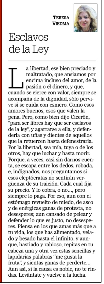 Esclavos de la ley Publicado el 28/11/2023 en Diario Jaén Descubre más desde TERESA VIEDMA JURADO Suscríbete y recibe las últimas entradas en tu correo electrónico. Escribe tu correo electrónico… Suscribirse Comparte esto: Haz clic para compartir en X (Se abre en una ventana nueva) X Haz clic para compartir en Facebook (Se abre en una ventana nueva) Facebook Haz clic para compartir en WhatsApp (Se abre en una ventana nueva) WhatsApp Más Haz clic para compartir en LinkedIn (Se abre en una ventana nueva) LinkedIn Me gusta Cargando... Relacionado