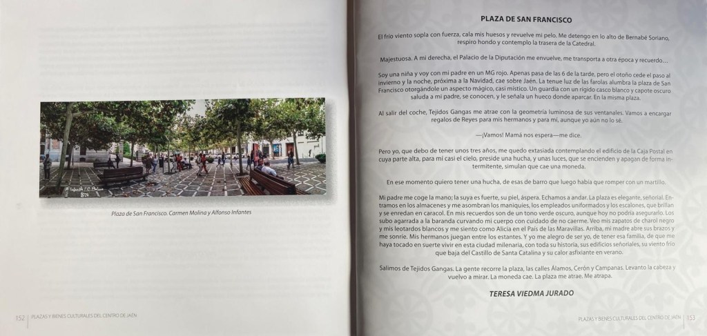 Soy una niña y voy con mi padre en un MG rojo. Apenas pasa de las 6 de la tarde, pero el otoño cede el paso al invierno y la noche, próxima a la Navidad, cae sobre Jaén. La tenue luz de las farolas alumbra la plaza de San Francisco otorgándole un aspecto mágico, casi místico. Un guardia con un rígido casco blanco y capote oscuro saluda a mi padre, se conocen, y le señala un hueco donde aparcar. En la misma plaza.