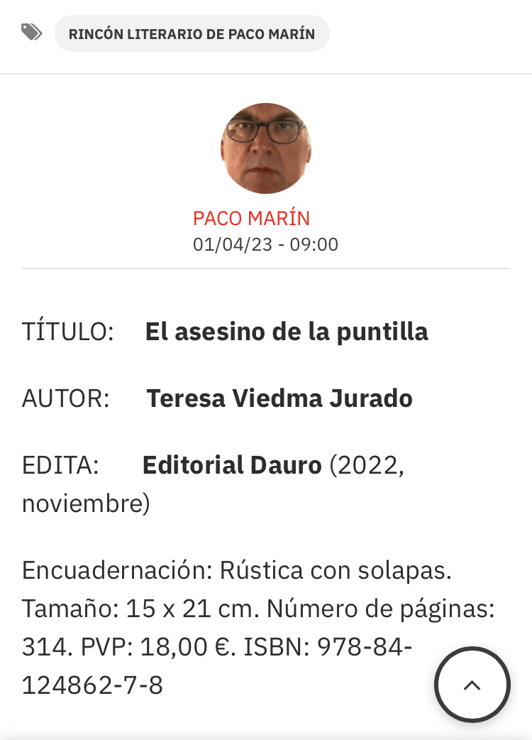 El asesino de la puntilla: reseña y entrevista en el Rincón Literario de Paco Marín. Cartagena Actualidad y Murcia Actualidad. https://www.cartagenaactualidad.com/articulo/rincon-literario-de-paco-marin/rincon-literario-asesino-puntilla/20230331104613108339.html https://murciaactualidad.com/rincon-literario-de-paco-marin-el-asesino-de-la-puntilla/