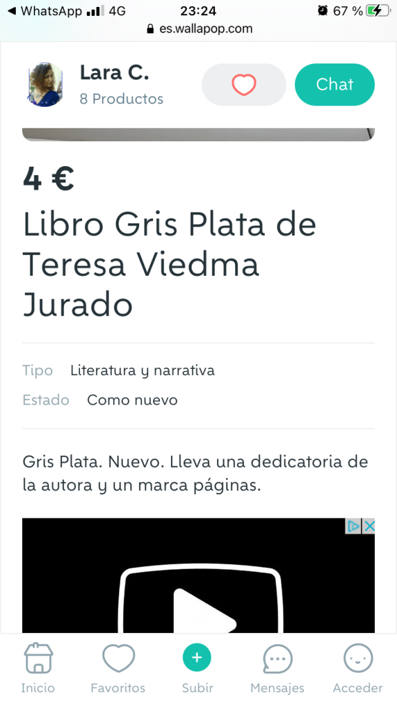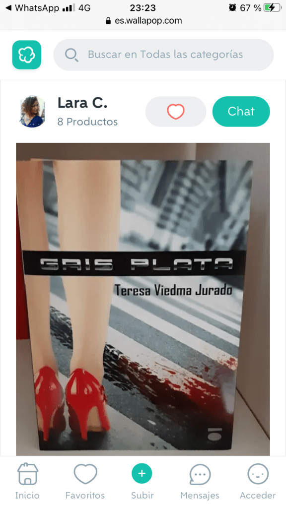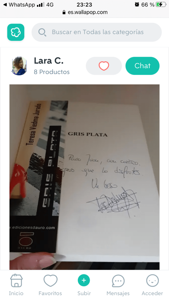 Pues bien, mis novelas se venden en todas las plataformas y librerías de España e Hispanoamérica, cosa que me alegra, pero mi sorpresa ha sido encontrarla en Wallapop. No es raro, siempre se han vendido libros de segunda mano y eso es bueno, a veces se encuentran auténticas obras de arte a precio de ganga. Lo que me ha sorprendido es que el hallado sea justo el ejemplar que le regalé y dediqué al director general de salud de la susodicha empresa. Lo vende una chica que se hace llamar Lara C. , parece ser que ubicada en Badalona, que lo valora en 4€ , lo cual me enorgullece ya que vende otros a 3€. En su oferta asegura que la novela está en buen estado y va acompañada de un marcapáginas destacando, como hecho diferencial, que va dedicado por la autora, o sea, yo.