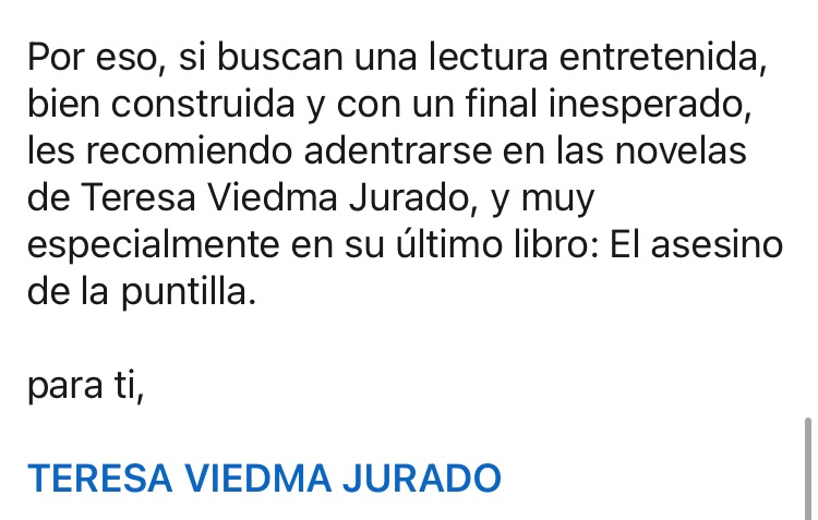 GRANDE TERESA!!!!! Acabo de terminarlo y sin duda lo recomendaré…..Tu amigo Juan tiene que estar orgullosisimo de ti allí donde esté y te diré que el libro engancha desde la primera hasta la última página.